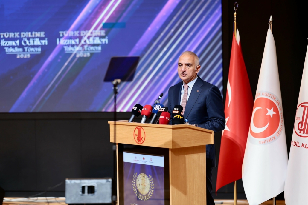 Kültür ve Turizm Bakanımız Sayın Mehmet Nuri ERSOY yaptığı konuşmada dilin, bir milletin hafızası ve vicdanı olduğuna dikkat çekerek Türkçeye yapılan her katkının doğrudan bu kültüre ve bu topraklara verilen bir hizmet olduğunu ifade etti. Türk dilinin, yüzyıllar boyunca sayısız ismin emeğiyle yoğrularak günümüze ulaşmış köklü bir dil olduğunu belirten Sayın ERSOY, ulu önder Gazi Mustafa Kemal ATATÜRK’ün öncülüğünde kurulan Türk Dil Kurumunun Türk dilinin bilimsel ve kültürel alandaki saygınlığını artırmak amacıyla önemli çalışmalar yürüttüğünü kaydetti ve “Türk Diline Hizmet Ödülleri”nin Türkçeye gönül vermiş kişi ve kurumları teşvik eden değerli bir vefa göstergesi olduğunu ifade etti.