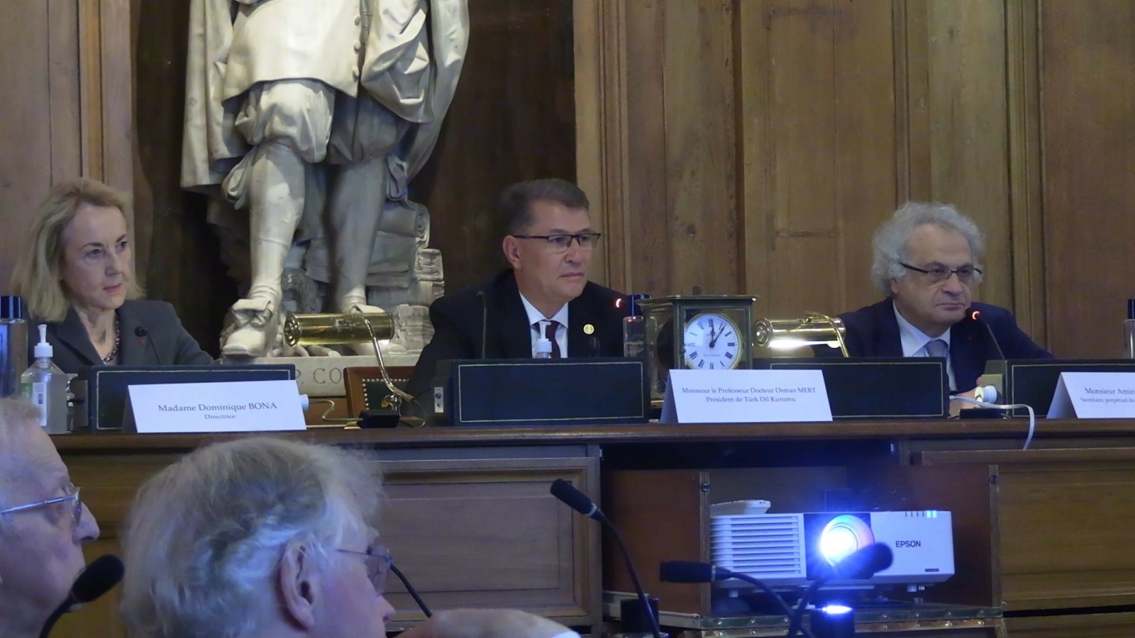 TDK Başkanı Prof. Dr. Osman MERT ise konuşmasında, 17. yüzyıldan bu yana Fransız diline yön veren Fransız Akademisinin dünyadaki tüm dil kurumları için bir referans noktası olduğunu söyledi. TDK’nin görece genç bir kurum olmasına rağmen Türkçenin kadim ve köklü tarihi ile çok büyük bir hazinenin koruyucusu olduğunu belirten MERT, günümüzde kültürlerin hızla iç içe geçtiği, hatta zaman zaman silikleştiği bir çağda dil bilincinin önemine dikkat çekti. “Bugün her zamankinden daha çok birbirimizi dinlemeye, tecrübelerimizi paylaşmaya ve dillerimizi geleceğe birlikte taşımaya ihtiyacımız var.” dedi.