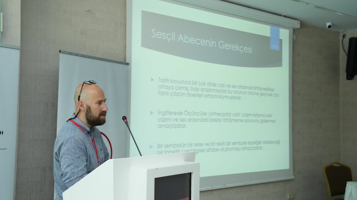 Doç. Dr. Harun ŞAHİN yaptığı konuşmada, Türkiye Türkçesinde ses biliminin yeri ve önemi üzerinde durarak “harf-ses-anlam” üçgenindeki ilişkiden bahsetti. Her sesin bir anlam değerinin parçası olduğunun altını çizen ŞAHİN, dillerin kendilerine has özellikleri olduğunu vurguladı.