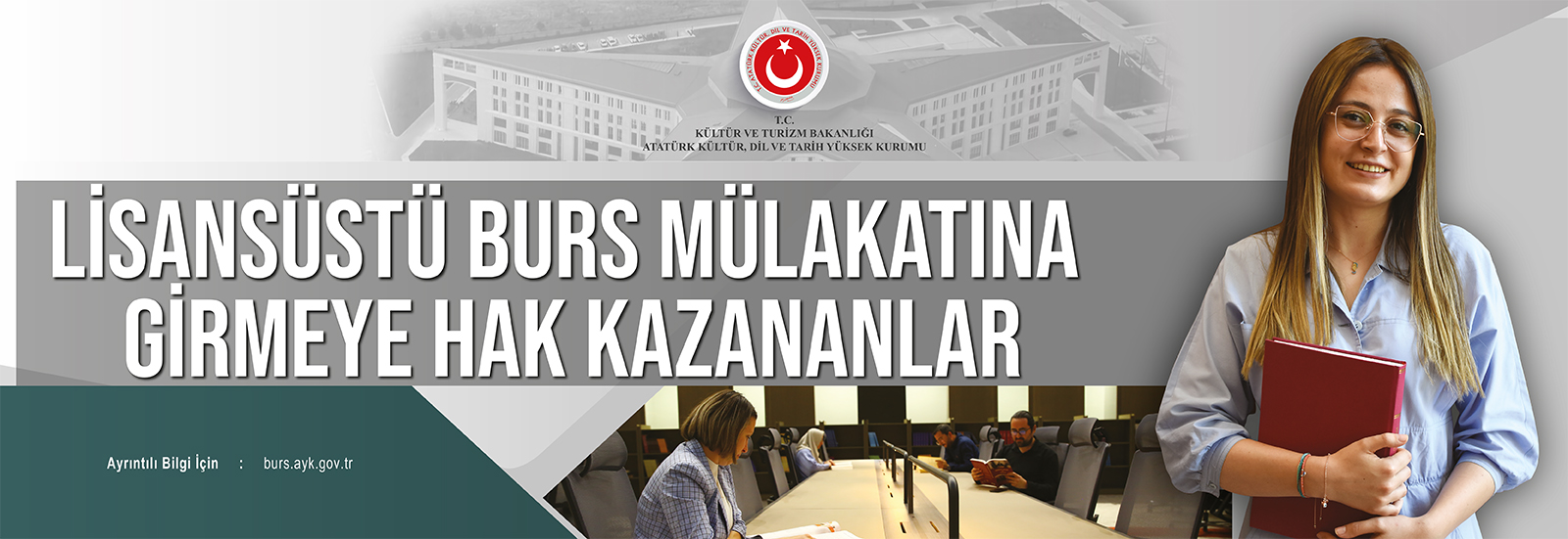Kurumumuz tarafından 2026 yılında verilecek olan yüksek lisans ve doktora burslarına ilişkin başvuru değerlendirme süreci sona ermiş olup lisansüstü burs mülakatına girmeye hak kazanan adaylar belirlenmiştir. Başvuru sahipleri, burs başvuru sonuçlarını www.turkiye.gov.tr adresinde yer alan Atatürk Kültür, Dil ve Tarih Yüksek Kurumu Burs Sonuç Takip Sistemi üzerinden sorgulayabilirler.